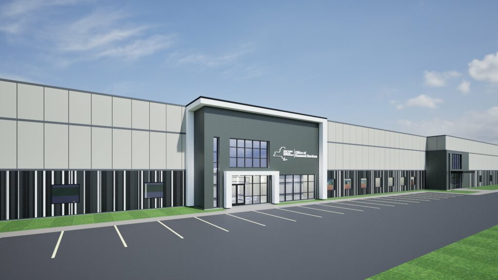 New York State Office of General Services main warehouse built by Luizzi Companies. This approximately 6 million cubic foot warehouse is designed for efficiency as it consolidates 4 existing warehouses into one centralized space with a range of measures and materials to help reduce its carbon footprint including: ENERGY STAR-certified mechanicals, LED lighting on occupancy sensors, and a well-insulated building exterior.